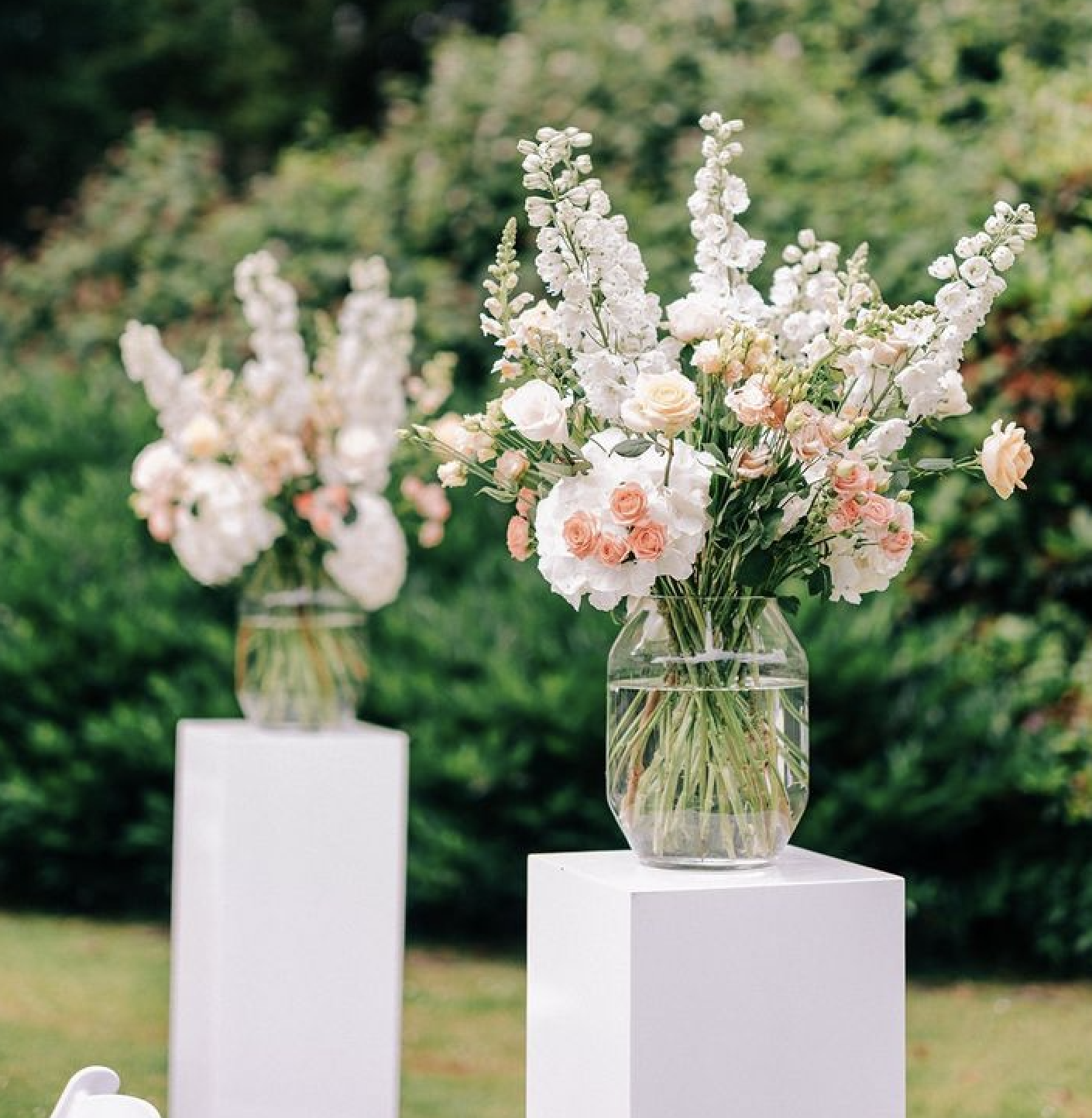 Elegante pilaren met vazen die hoogte, luxe en balans toevoegen aan iedere ruimte. Perfect voor entrees, ceremoniepaden of podia en volledig te stylen in lijn met jouw eventconcept.