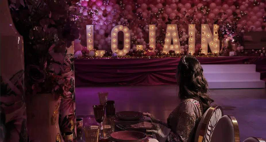 Geïnspireerd door het Bridgerton-tijdperk creëerde BASMA een decor vol romantische details. Denk aan zilveren accenten, zachte pasteltinten, kaarslicht en barokke bloemstukken. Elk element was zorgvuldig gekozen om de naam “Lojain” – wat “zilver” betekent – tot leven te brengen.