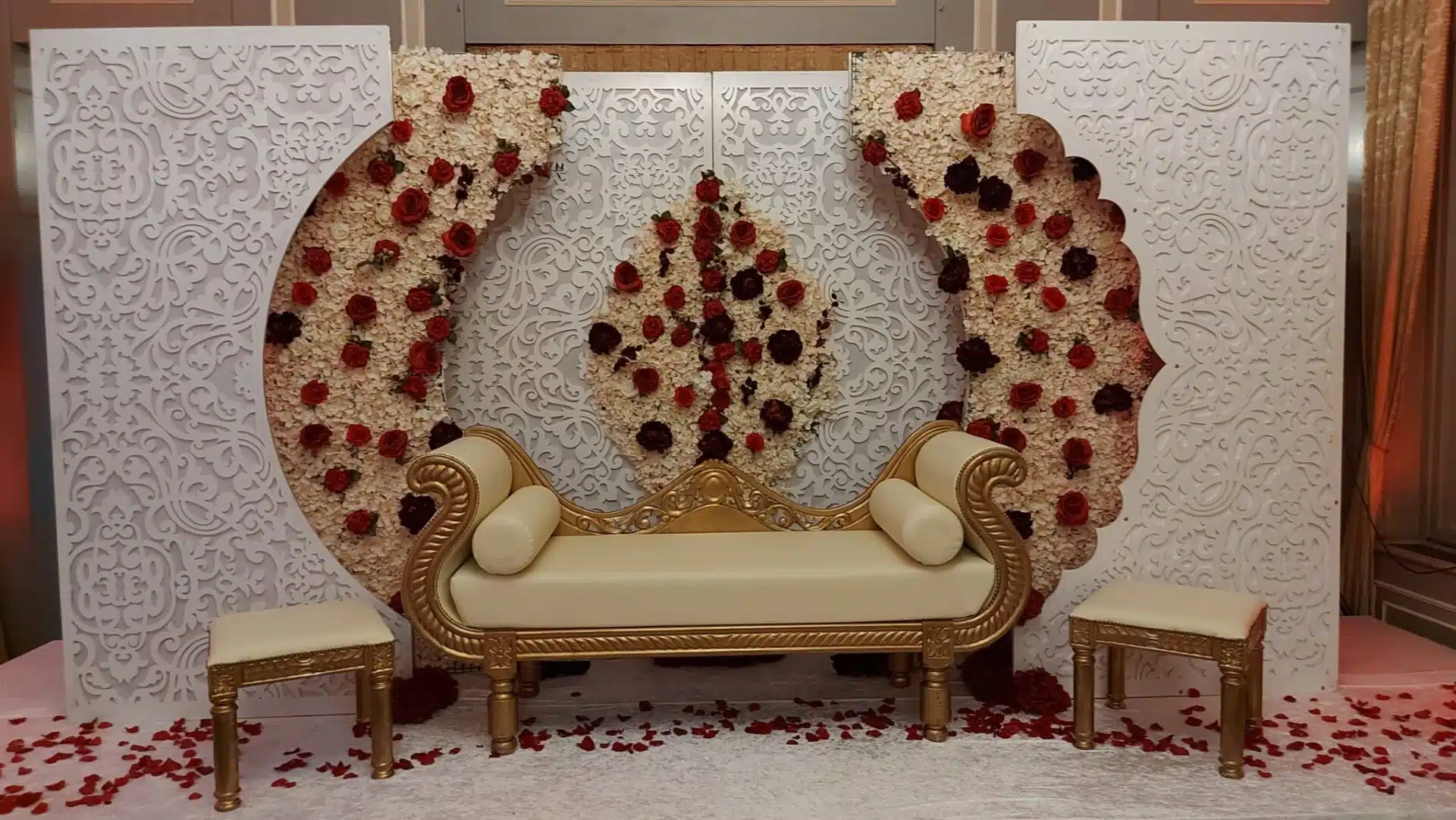 Deze prachtige bride stage is gecombineerd met de xylofoon bank en rode rozen