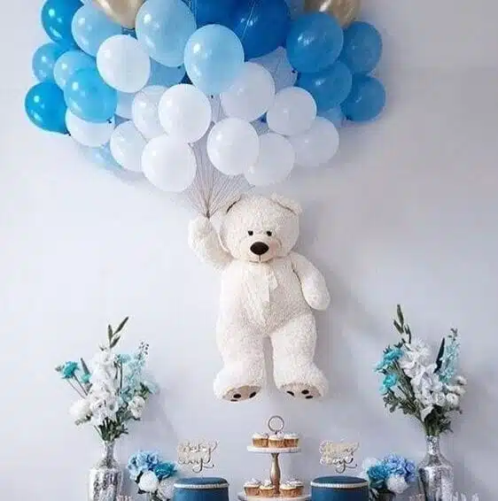Een gender reveal, babyshower of een kraamfeest, maak niet uit welk feest is voor je newborn. Bear with balloons is echt een eyecatcher op jouw feest. Zoals je op de foto ziet kan je de beer heel leuk boven de tafel doen, maar er zijn meer mogelijkheden dat je kunt doen met de beer. BASMA Weddings personaliseert jouw Bear with balloons in het thema van jouw feest.